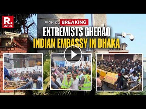 BREAKING: Bangladeshi Group Attacks Indian Embassy In DhakaTensions rise in Dhaka as a Bangladeshi group targets the Indian Embassy, accusing India of interference. Protesters gathered near the High Commission, prompting India's Ministry of External Affairs to summon the Bangladeshi envoy in New Delhi.