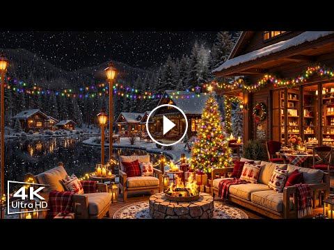 Cozy Christmas Coffee Shop Ambience Warm Christmas Jazz Music with Crackling Fireplace & Snowfall