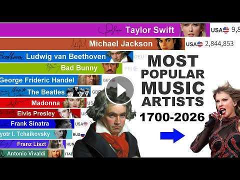 Who is the most popular music artist of all time? Watch the epic evolution of the top most popular music artists in history, from the classical masterpieces of baroque starts like Corelli and classical giants like Beethoven to the modern pop dominance of Bad Bunny and Taylor Swift (1700 - 2026).In this 20-minute cinematic data visualization and bar chart race, we journey through over 300 years of music history to answer one ultimate question: Who ruled music? Witness the rise and fall of musical empires, the birth of recorded audio, the rock & roll explosion led by Elvis Presley and The Beatles, the King of Pop Michael Jackson, and the modern streaming era dominated by artists like The Weeknd and Taylor Swift.