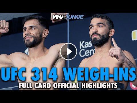 Check out the highlights from UFC 314 official weigh-ins, where 25 of the 26 fighters on the card made weight ahead of Saturday’s event in Miami.Full weigh-in coverage: https://mmajunkie.usatoday.com/2025/04/ufc-314-volkanovski-vs-lopes-weigh-in-results-live-video-stream